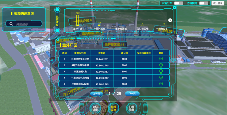 接入電廠現有的視頻監控系統、門禁系統以及項目現場建設的定位設備,實現定位設備、視頻監控設備、門禁設備的區域分布,三維可視化分布、設備快速查找、視頻快速調取、門禁日志快速查詢的功能。